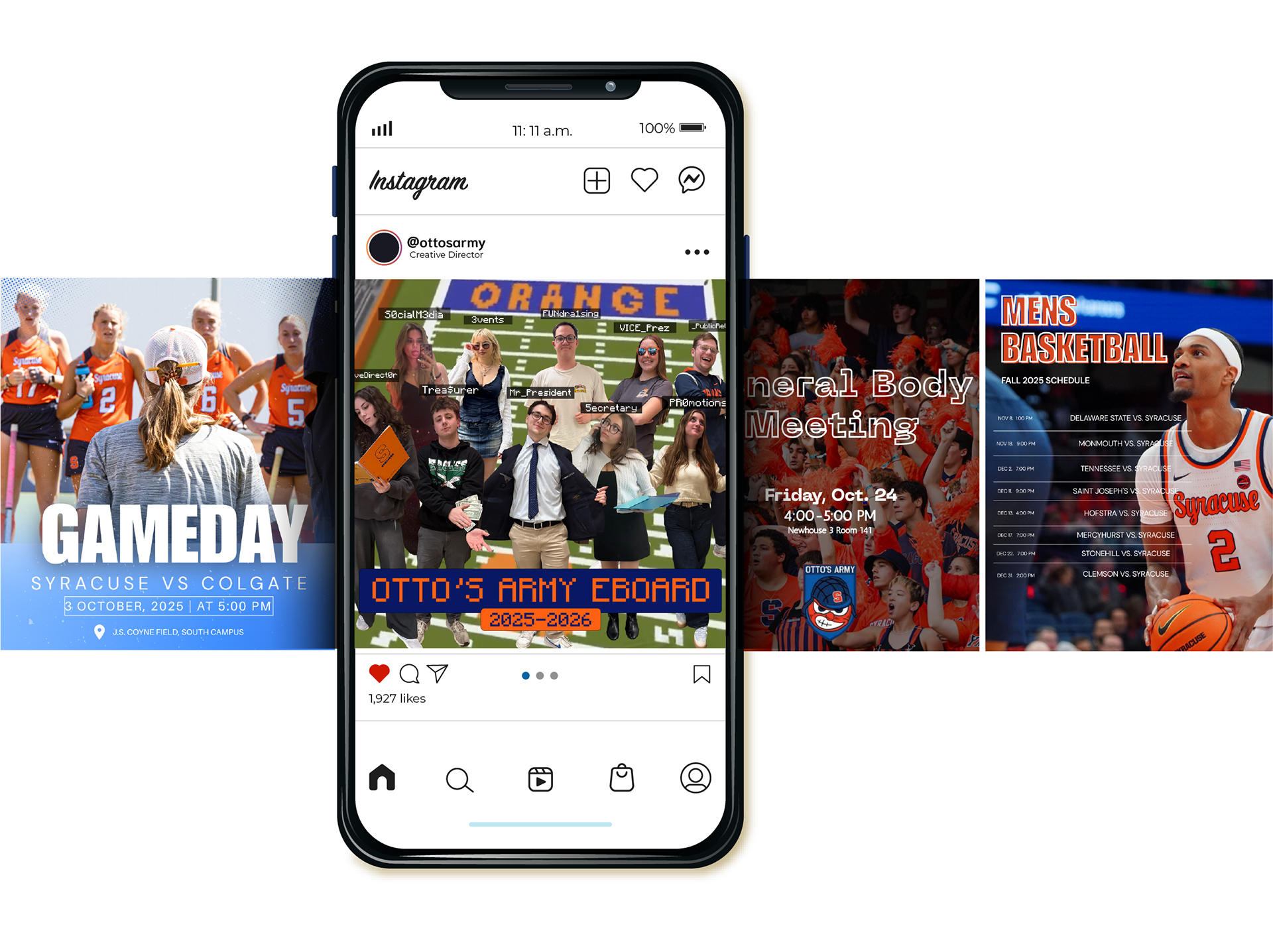 As the Creative Director of Syracuse University’s official student section, Otto’s Army, I create weekly posting schedules and design engaging graphics for Instagram to elevate student engagement.